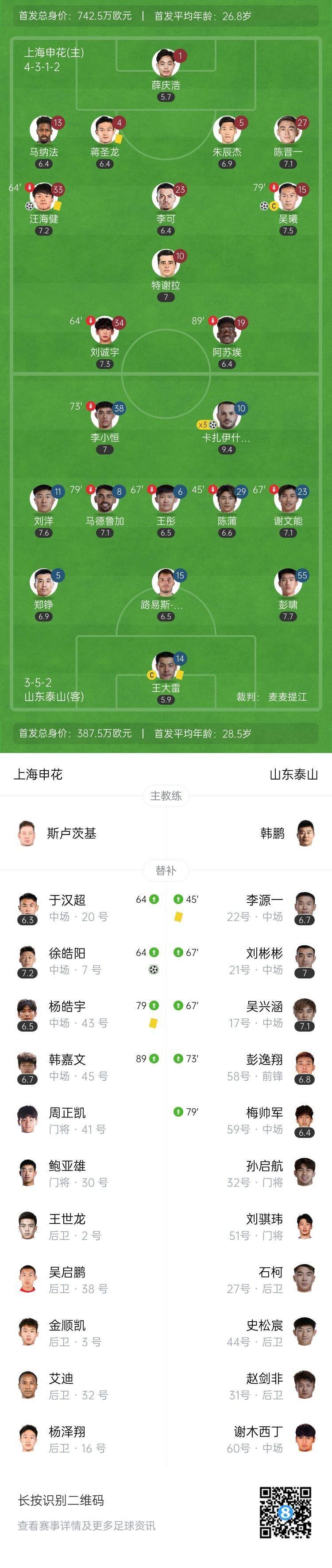 全场比赛结束,申花3-3战平泰山。
